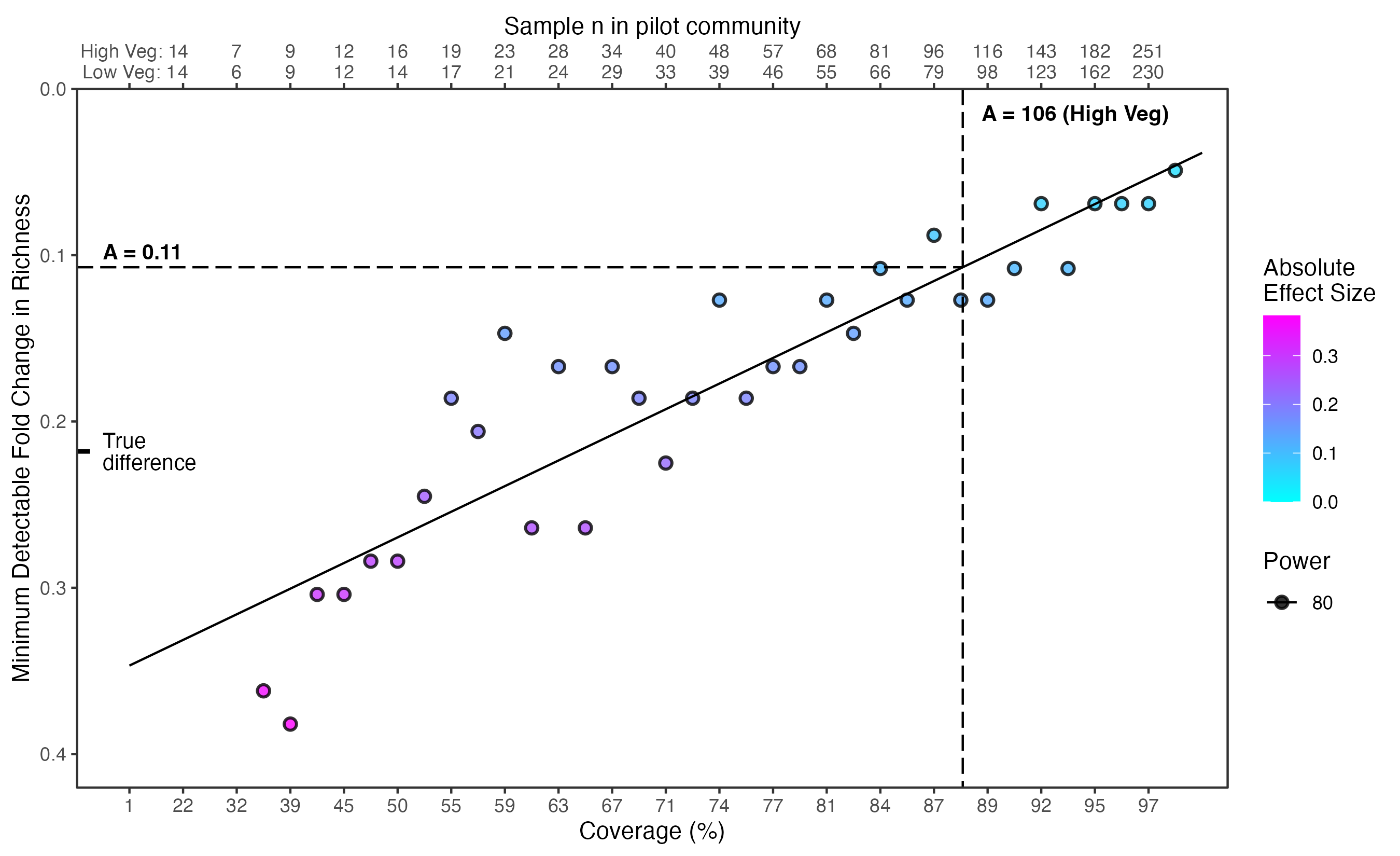 Second, downsample_boots() uses replicated simulated communities with known differences in richness (effect sizes) to simulate the differences that would be detected if fewer samples were taken. This function produces a functional relationship between sample coverage (the proportion of the community thought to be present in the given sample number), and the minimum difference in richness that can be confidently detected.